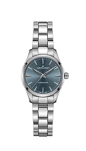 Timeless and refined, the Jazzmaster Quartz 32mm features a dark dusty blue sunray-brushed dial accented by skeletonized Dauphine hands for a modern twist on heritage style. Its ultra-flat case and brushed-polished detailing create a sleek silhouette. A classic dress watch designed for effortless sophistication.