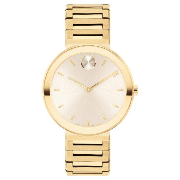 Refining sleek, contemporary style in an ultra-thin design. The 34mm case of this sophisticated Movado BOLD Horizon watch is only 6.5mm thick, creating a super sleek silhouette. This timepiece is crafted from pale yellow gold ion-plated stainless steel and features a matching Y-link bracelet and chalk dial with pale yellow gold-toned accents.