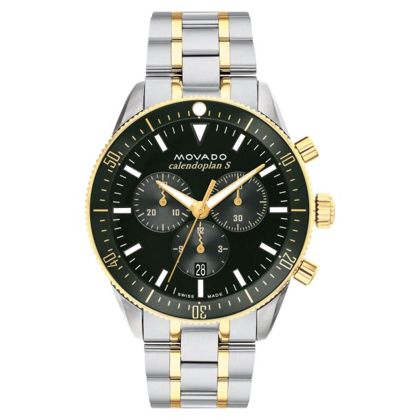Iconic mid-century design gets a fresh feel. First introduced in 1950, this contemporary-cool design is inspired by our archives with a modern sporty feel. This timepiece features a two-tone 42mm case in classic stainless steel accented by yellow gold ion-plating with a green unidirectional rotating bezel. The green chronograph dial is outfitted with three subdials, Swiss Super-LumiNova accents and a date window. We’ve completed the design with a fluid bracelet in versatile stainless steel with gleaming yellow gold ion-plated accents. 42mm Stainless Steel And Yellow Gold Ionic Plated Stainless Steel And Green Aluminum Case and Two-Tone Stainless Steel Link Bracelet Sapphire crystal Dial: Green With Arabic Index Quartz Chronograph Movement Water-resistant up to 5 ATM