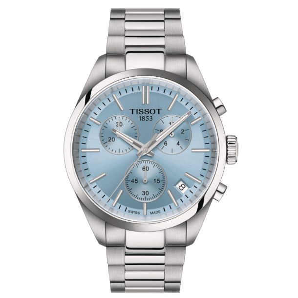 The Tissot PR100 collection offers classic quartz chronographs in various colours. These sporty yet classy timepieces feature a polished middle row on the bracelet for a shinier look, a white disc in the date window, and a standard second hand. The G10.212 chrono quartz movement provides precision and robustness, complemented by water resistance up to 10 bar (100 meters/330 feet), and visibility in low-light conditions is guaranteed by the Super-LumiNova coating on the needle-shaped hands. Collection: T-Classic Weight: 135 Gender: Men Water Resistance: Water-resistant up to a pressure of 10 bar (100 m / 330 ft) Length: 40.00 Width: 40.00 Thickness: 11.3 Lugs: 20.00 Case Shape: Round Case Material: 316L stainless steel case Crystal: Scratch-resistant sapphire crystal Energy: Quartz EOL Movement: Swiss quartz Battery: Battery type Renata 394 Functions: EOL (battery end-of-life indicator), Central 60-seconds chronograph hand, 30-minutes and 1/10 of a second counters, ADD and SPLIT functions Caliber: 13 1/4''' Diameter (mm): 29,8 Dial Color: Ice Blue